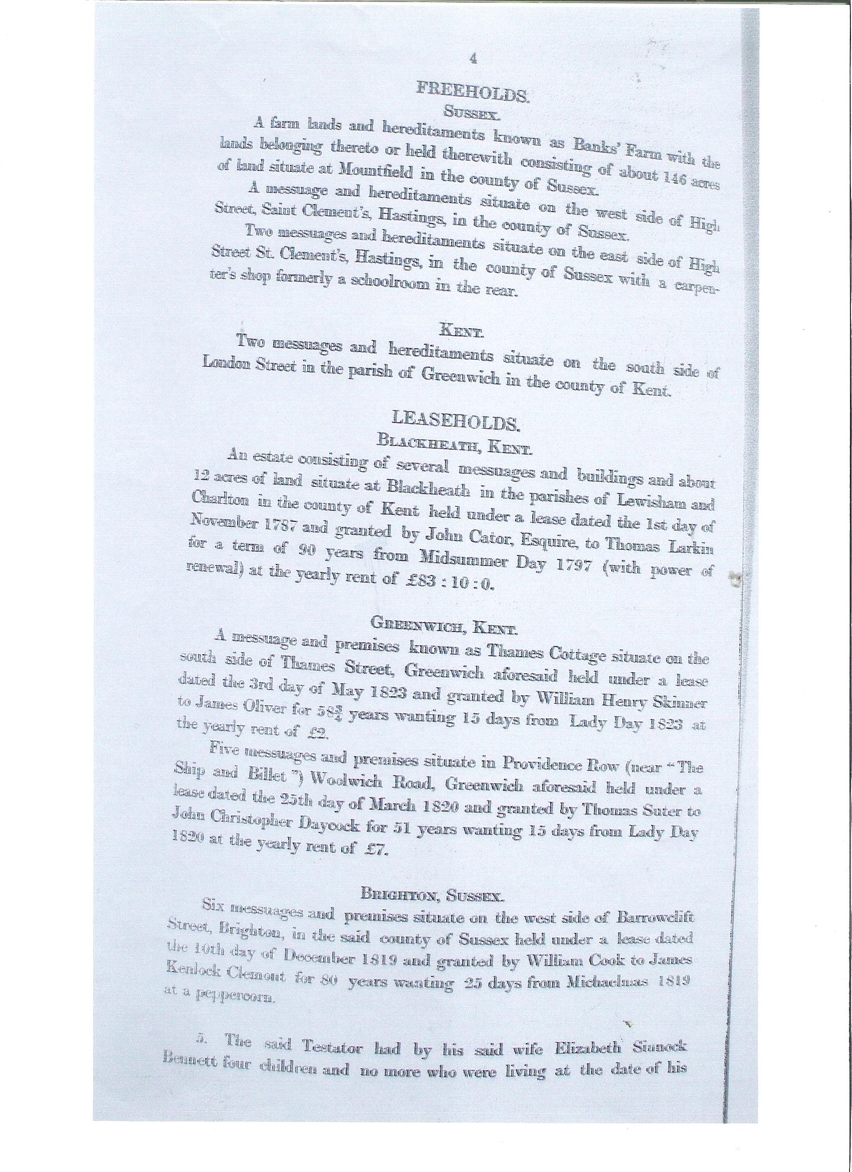 There are several references to the Bennetts watch and clockmaking firm being in existence as early as 1765 but unfortunately this headline on the Sir John Bennett notepaper does not say ” of Cheapside ” or of anywhere else . However , the discovery of a list of property leasehold and freehold owned by John Bennett senr, shows that he tenanted a property in Greenwich High St but that he owned freehold the Banks at Mountfield . This page came to light with other papers concerning the court case between Sir John and the widow of George Weedon Bennett and her new husband Mr Jenkins . Had it not been for our Australian cousins knowledge of the Bennett v Jenkins court cases we might never have discovered this list of property .. ( see The Banks Mountfield page )