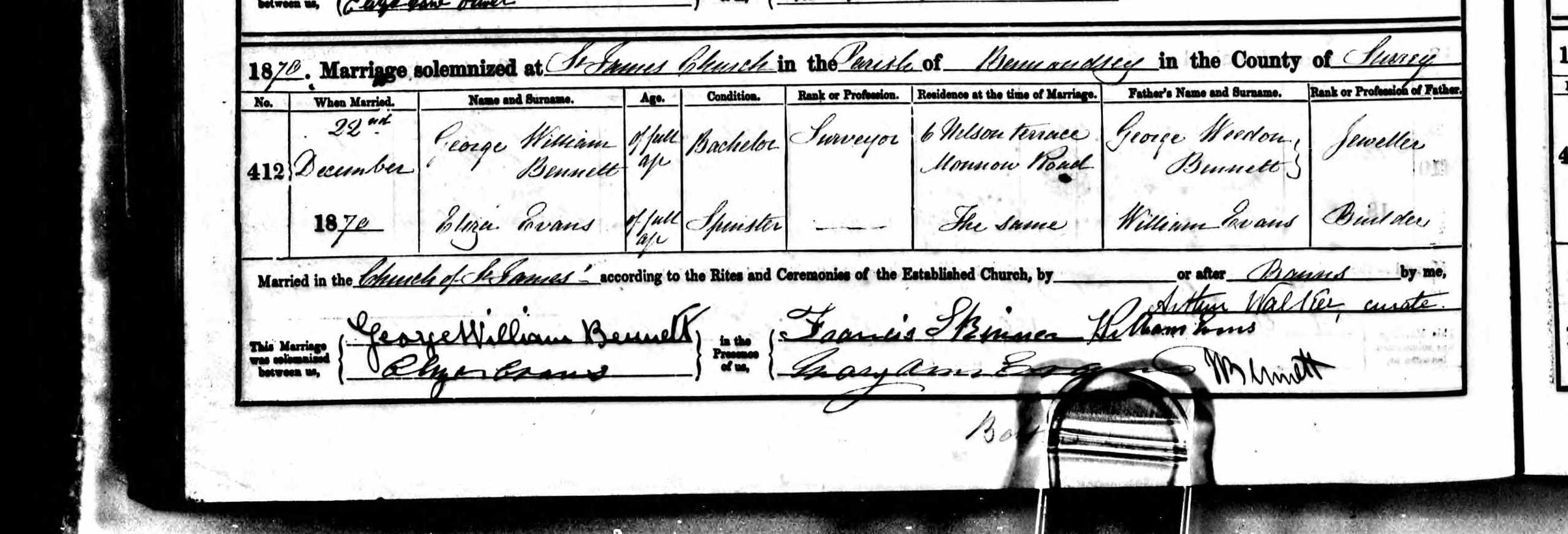 Following the death of George Weedon Bennett in 1861 , his widow Sarah Ann , now aged 30, remarried to Henry Jenkins. They were married at Holy Trinity Islington in Oct 1865 . He is described as a bachelor , a builder and the son of Henry Jenkins, dissenting minister . The witnesses seem to underline the family unity at this wedding . John Bennett is the first to sign, followed by A W Gilbert, her nephew in law, and Elizabeth Gilbert, and representing the Jenkins , E W Jenkins, M A Jenkins and John Jenkins . Nevertheless in 1869 the London Gazette reports that there is a Chancery case Jenkins v Bennett in which Henry Jenkins and another are the defendants against John Bennett and others , creditors , in the matter of the estate of George Weedon Bennett . By 1871 the Court of Chancery has made an order for the sale of the leasehold and rental properties of the late George Weedon Bennett , to be sold in 11 lots , certain leasehold ground rents , amounting to £160 per annum , for terms expiring at Christmas 1951 secured on 17 premises . Most of these were 1 – 22 The Avenue, Bennett Park and then a set of 4 properties plus a business premises and dwelling house in Brunswick Place . What happened next is not clear . But as late as 1928 under a heading Dormant Funds in Chancery , the Bennett v Bennett suit is unresolved and the funds which may be held from 1867 for the benefit of Leonard Willmott Bennett ,infant in 1867, and John Sydenham Bennett also an infant in 1867 , had not been dealt with . Perhaps there were no funds left but this is the last mention of the cases Jenkins v Bennett and Bennett v Bennett .