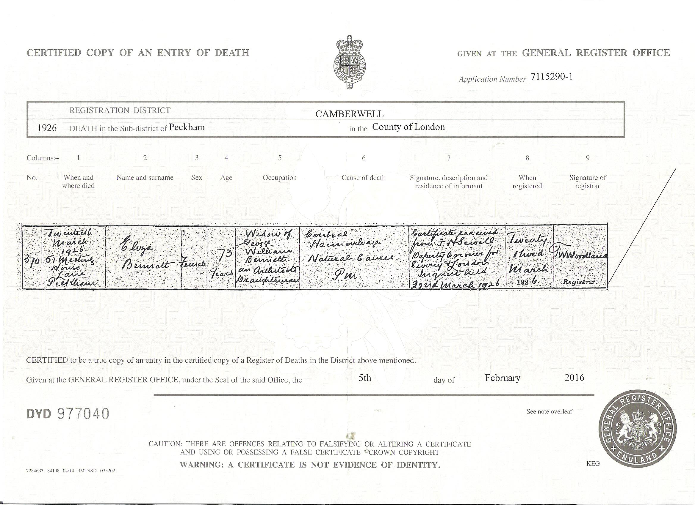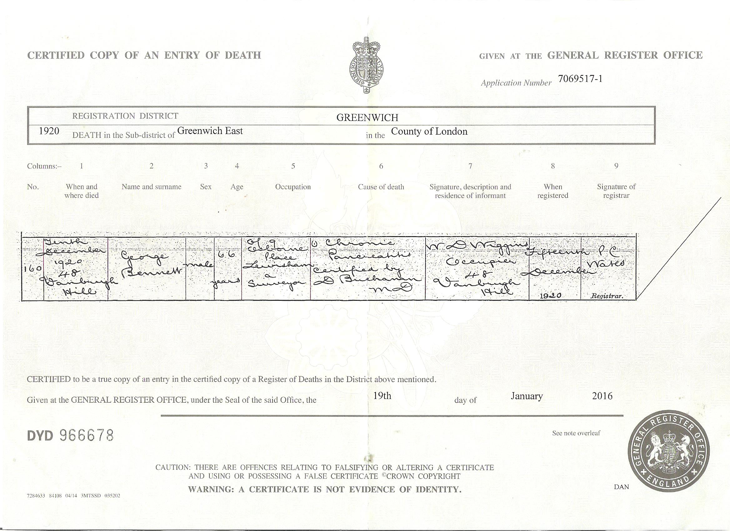 The final document is the death certificate of George Williams Bennett. This has only come to light this January (2016) . It was as a result of finding a possible death for him in the FreeBMD online site. Working forward from 1918 a few years at a time, it was possible to eliminate both the Unknowns in the indexes , none came close to the correct age, and so that eliminated a nameless body found in the street or the river . Assuming therefore that he died able to give his name , it was just a question of finding a Camberwell/Lewisham/Greenwich death registered of a George in the 60 -70 age range . The first certificate ordered was the right one. George died on 10th Dec 1920 so not too long after he walked out of the workhouse. He died at 48 Vanburgh Hill , which was the Greenwich Infirmary . He is recorded as being 66 so born 1854 almost correct, and is still of his childhood home of 9 Osborne Place , Lewisham , a surveyor . His cause of death is Chronic Pancreatitis which is mostly caused by chronic alcoholism . Its a sad end to a potentially successful life .